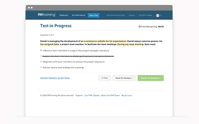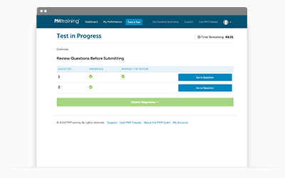 Mark your responses for review later, return to any PMP test question before getting results, and take the test using the same time limits as the real exam.